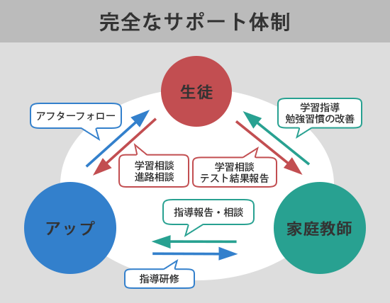 学習計画や指導方法の見直し、教師交代、進路・学習相談までトータルで支援します。